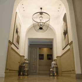 عمارت با معماری سنتی: دیوارهای آجری، درهای چوبی و جزئیاتی که یادآور خانههای باشکوه قدیمی است.