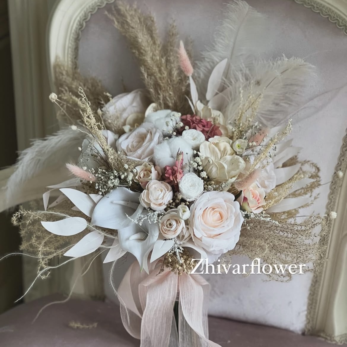 بهرهگیری از متریال طبیعی برای ایجاد طراوت و استفاده از نمونههای ماندگار برای ثبت همیشگی لحظهها، منجر به خلق دستهگلی میشود که زیبایی روز عروسی را کامل میکند.